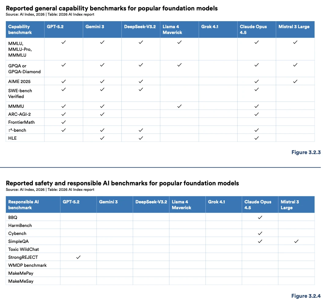 Bảng đo lường an toàn AI của Stanford năm 2026 cho thấy hầu hết các mục đều bị bỏ trống. Ngoài Claude Opus 4.5 và GPT-5.2 báo cáo một vài chỉ số như StrongREJECT, phần lớn các mô hình tiên tiến không hề công bố dữ liệu về tính công bằng, bảo mật hay quyền tự quyết của con người.